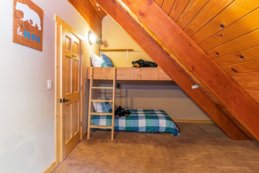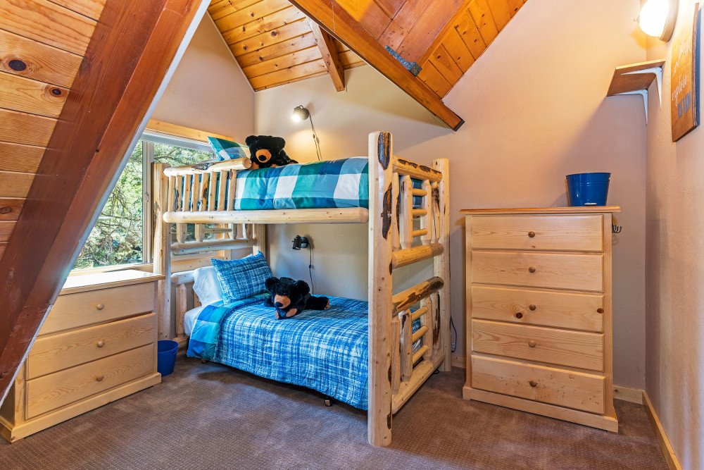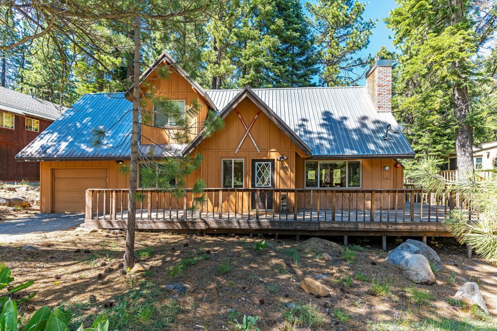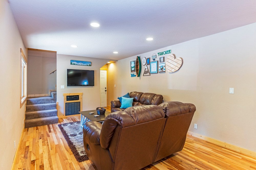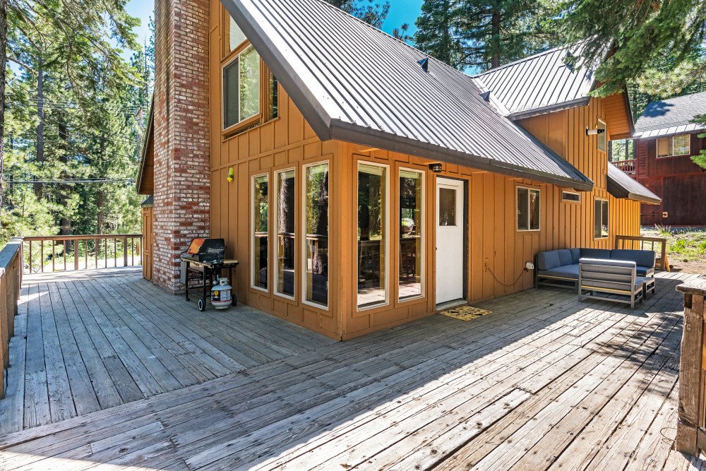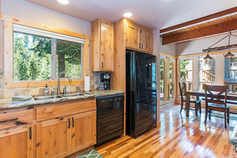 This 4 bedroom, 2 bath home is new to our rental program and is located in the lower half of Tahoe Donner, only 10 minutes from downtown Truckee and Donner Lake, and 20 minutes to all major ski resorts and north Lake Tahoe. Enter the home through the front door and mud room into the main living space. The great room area offers two sitting areas; one centered around the gas fireplace and another around the flat screen TV with a DVD player and streaming device. Other highlights include updated hardwood floors, a remodeled kitchen and dining for 6. A back door from the dining space leads to a large a sunny deck, equipped with a gas BBQ and outdoor furniture. Down the hall on the main floor, a shared bath with bathtub/shower combo and a bedroom are offered. The bedroom is furnished with a queen size murphy bed, desk and full size closet. Upstairs you’ll find the main bedroom floor and additional bathroom. The two queen size bedrooms offer lots of windows and are on opposite ends of the floor. In the middle of the floor is the shared bath with bathtub/shower combo and double vanity sinks, and a spacious bunk room with two twin bunks and plenty of floor space for kids to hang out.