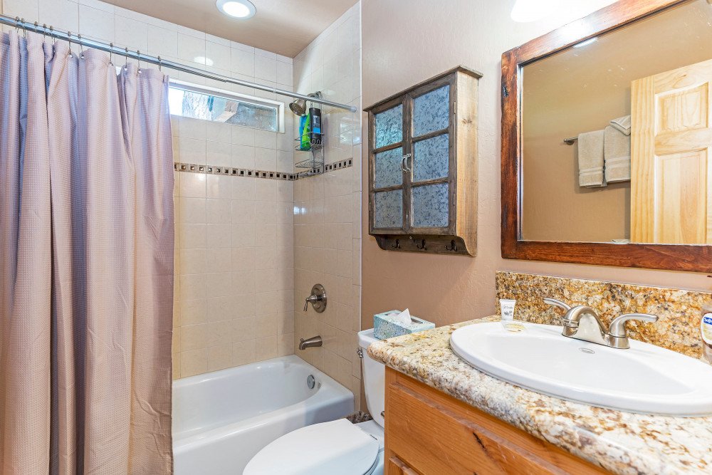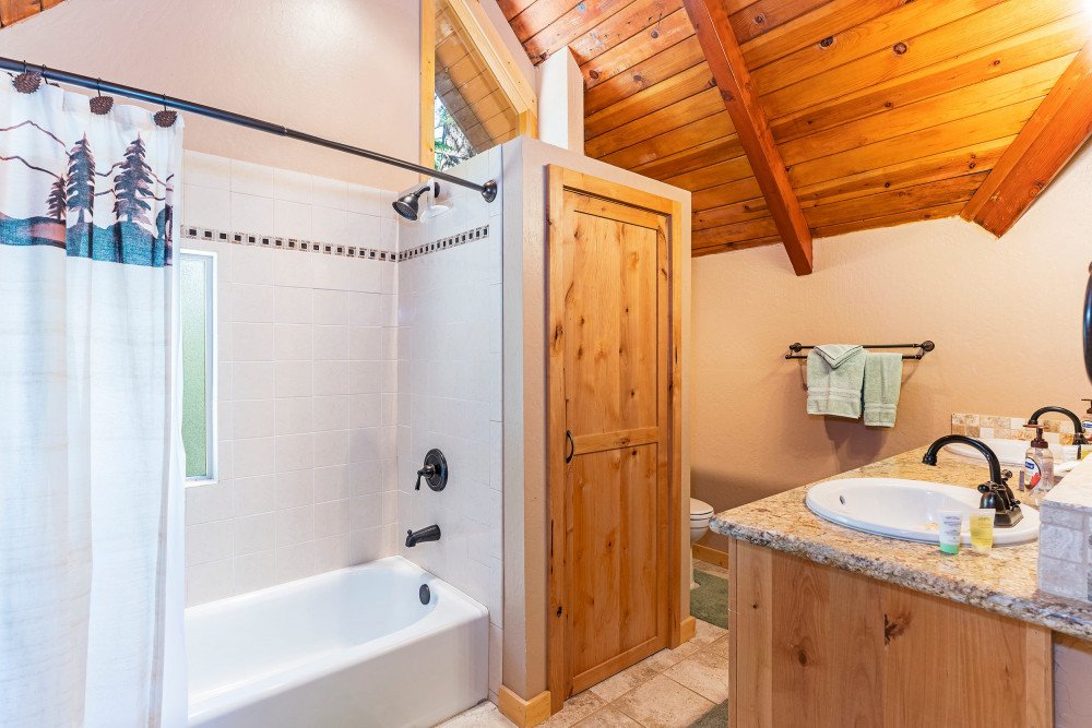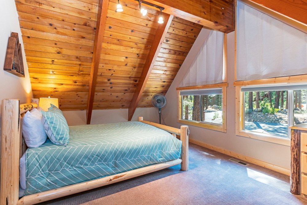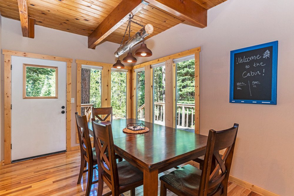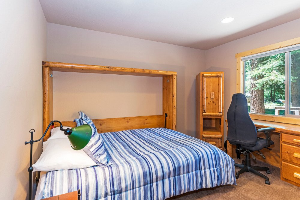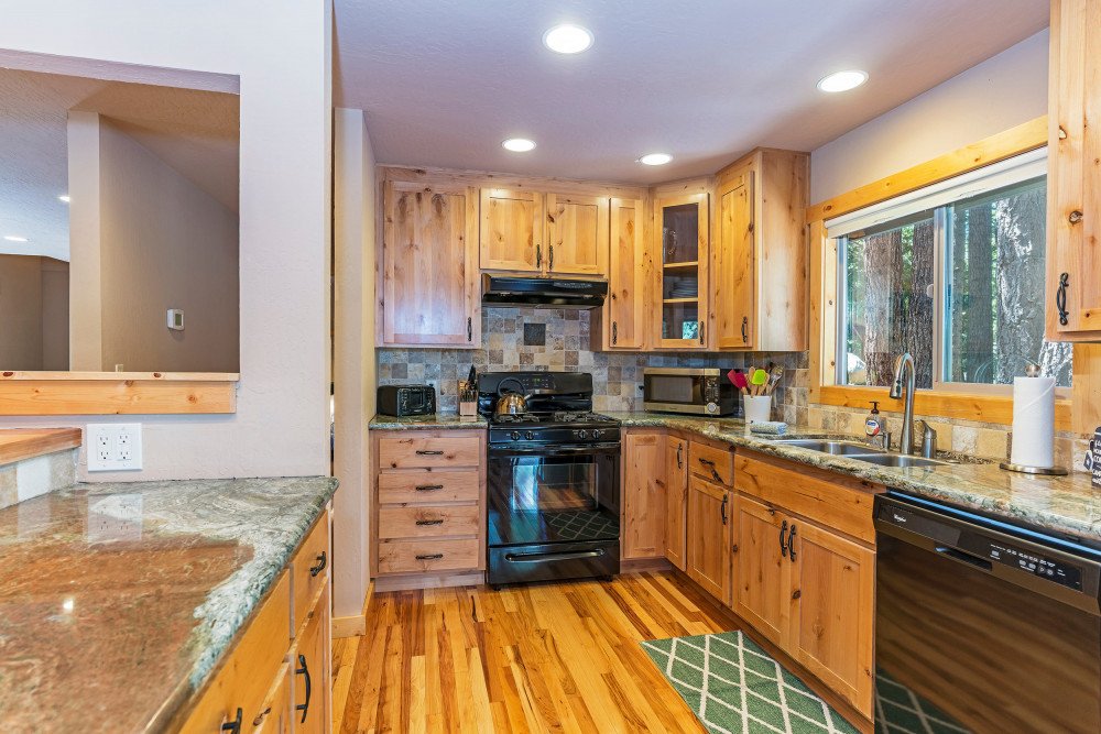 This 4 bedroom, 2 bath home is new to our rental program and is located in the lower half of Tahoe Donner, only 10 minutes from downtown Truckee and Donner Lake, and 20 minutes to all major ski resorts and north Lake Tahoe. Enter the home through the front door and mud room into the main living space. The great room area offers two sitting areas; one centered around the gas fireplace and another around the flat screen TV with a DVD player and streaming device. Other highlights include updated hardwood floors, a remodeled kitchen and dining for 6. A back door from the dining space leads to a large a sunny deck, equipped with a gas BBQ and outdoor furniture. Down the hall on the main floor, a shared bath with bathtub/shower combo and a bedroom are offered. The bedroom is furnished with a queen size murphy bed, desk and full size closet. Upstairs you’ll find the main bedroom floor and additional bathroom. The two queen size bedrooms offer lots of windows and are on opposite ends of the floor. In the middle of the floor is the shared bath with bathtub/shower combo and double vanity sinks, and a spacious bunk room with two twin bunks and plenty of floor space for kids to hang out.