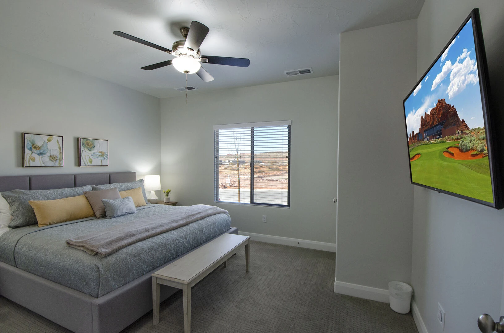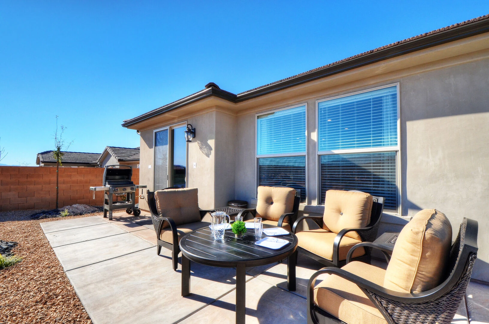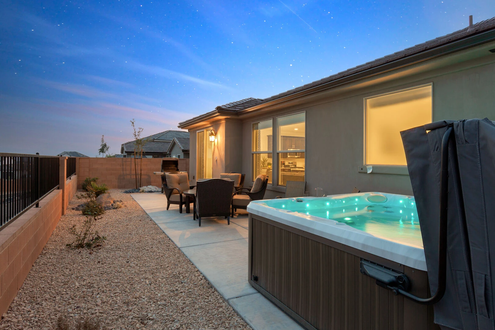 Enjoy a relaxing desert vacation when you stay at Whispering Sands at Paseos, the perfect place to get away from the stresses of everyday life! This elegant home is expertly designed to make you feel at home in the heart of luxury. Spend your days exploring the local scenery as you hike Zion National Park, splash in the waves at Sand Hollow State Park, or enjoy a night at the theater under the stars at Tuacahn Center for the Arts. As the sun sets, return home to your own desert paradise and cook some delicious food on the provided BBQ grill or in the spacious kitchen. Spend an evening under the stars in your private hot tub or lounging on the patio furniture to enjoy the beautiful desert night. Come inside and cozy up on the couch for a movie on the large TV, or challenge each other to matches on your own private Ping Pong Table. No matter what you enjoy, Whispering Sands at Paseos is sure to have something for you!