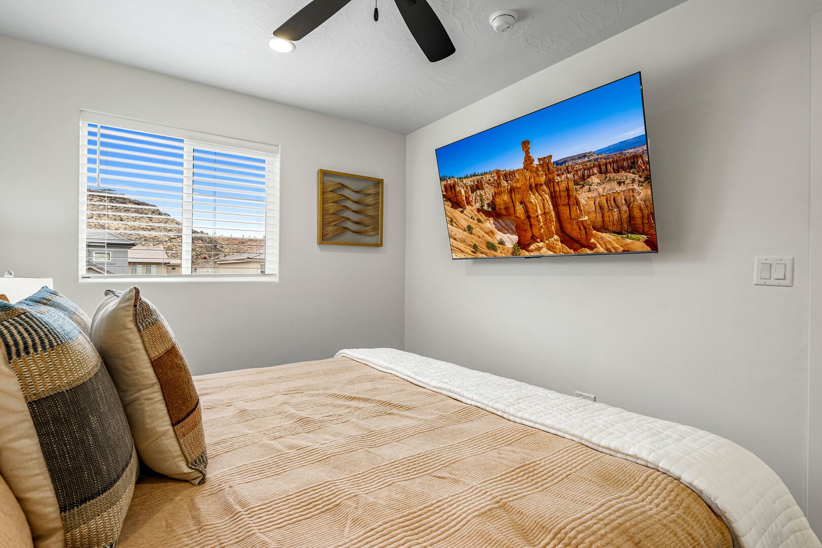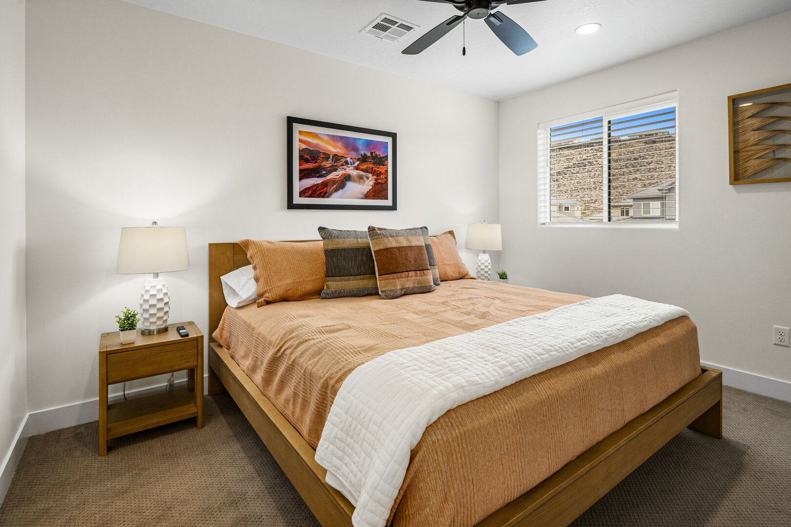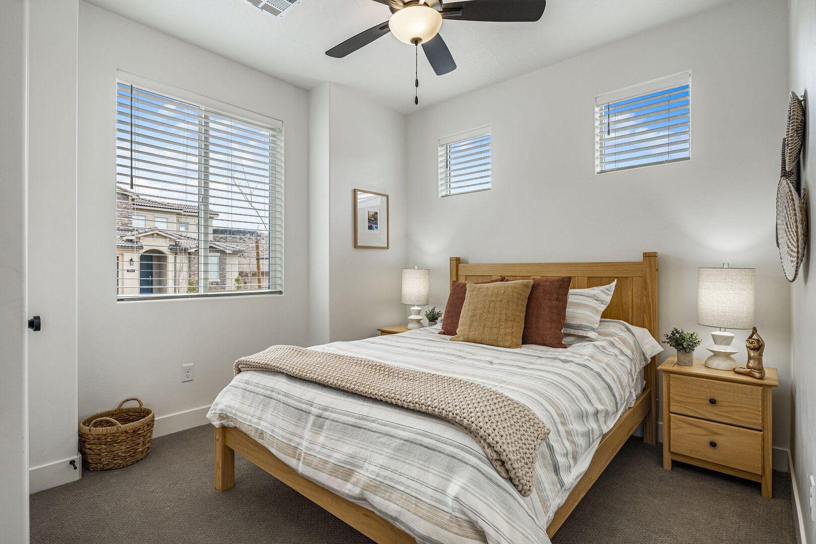 Queen Bedroom attached to a Shared Bathroom with a Shower/Tub Combo that opens up into the Entryway