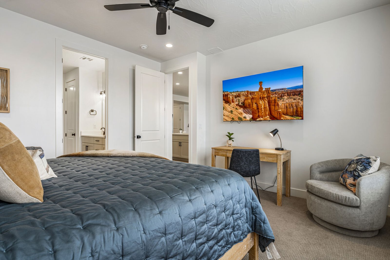 King Bedroom with a workspace attached to a private ensuite bathroom