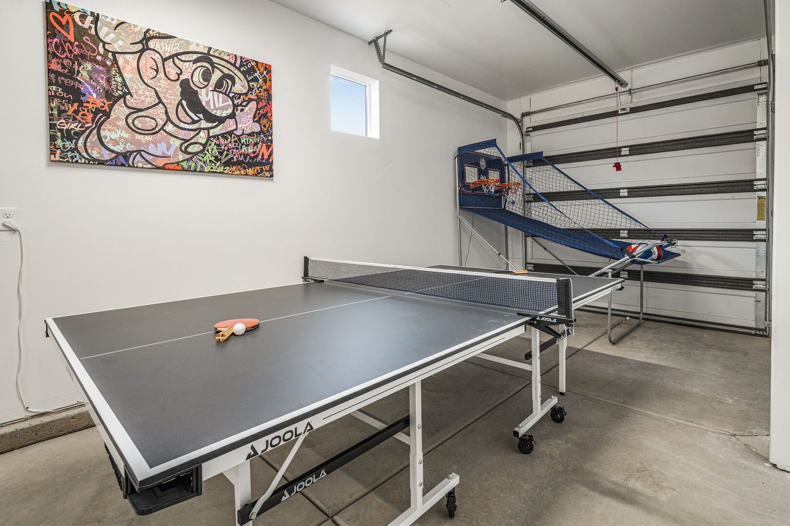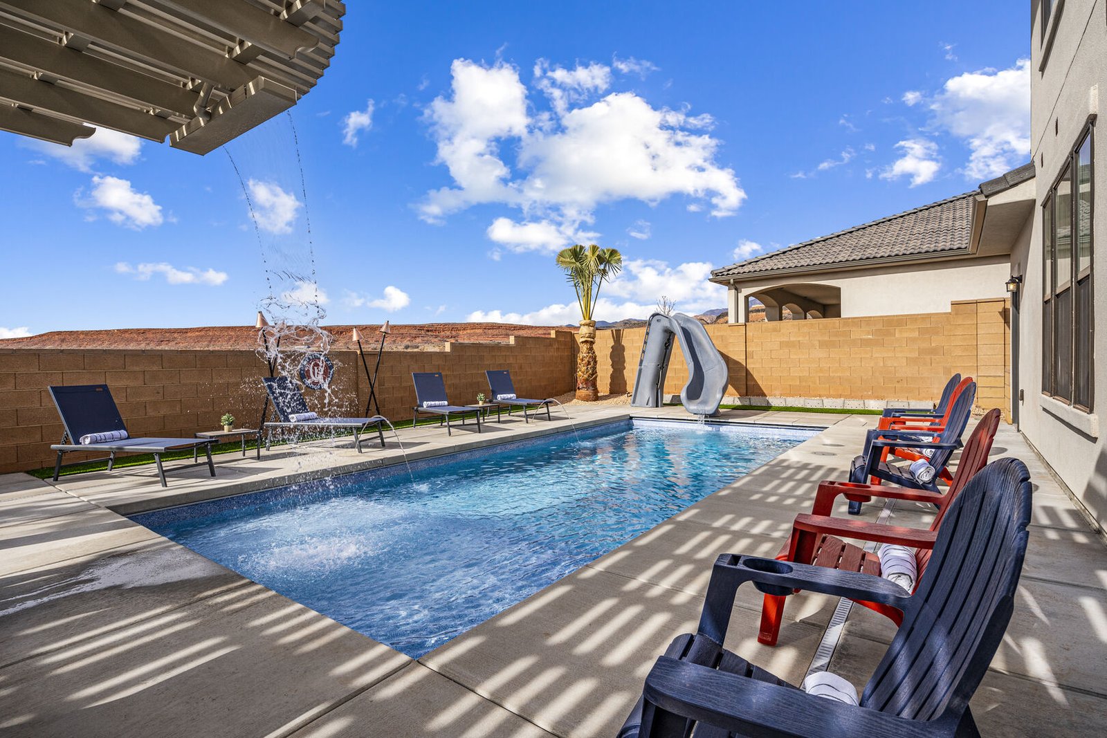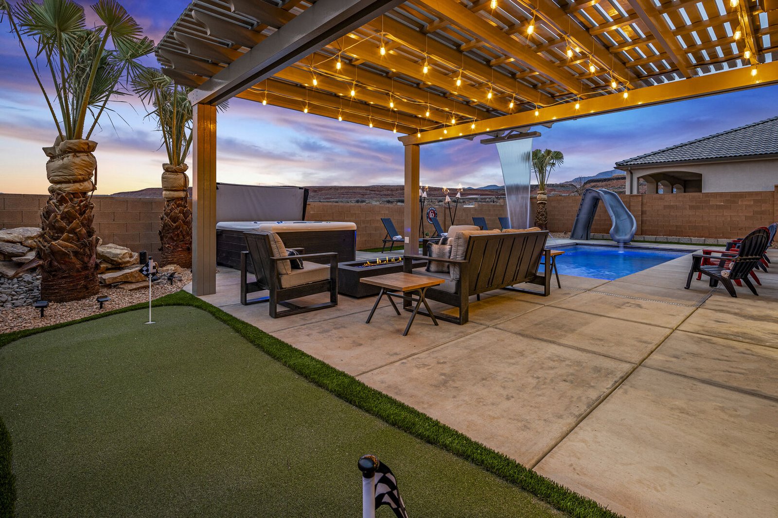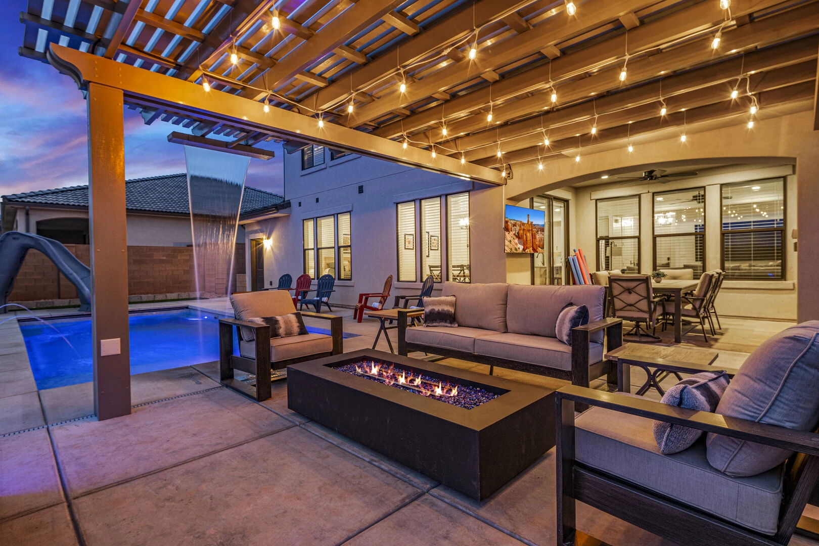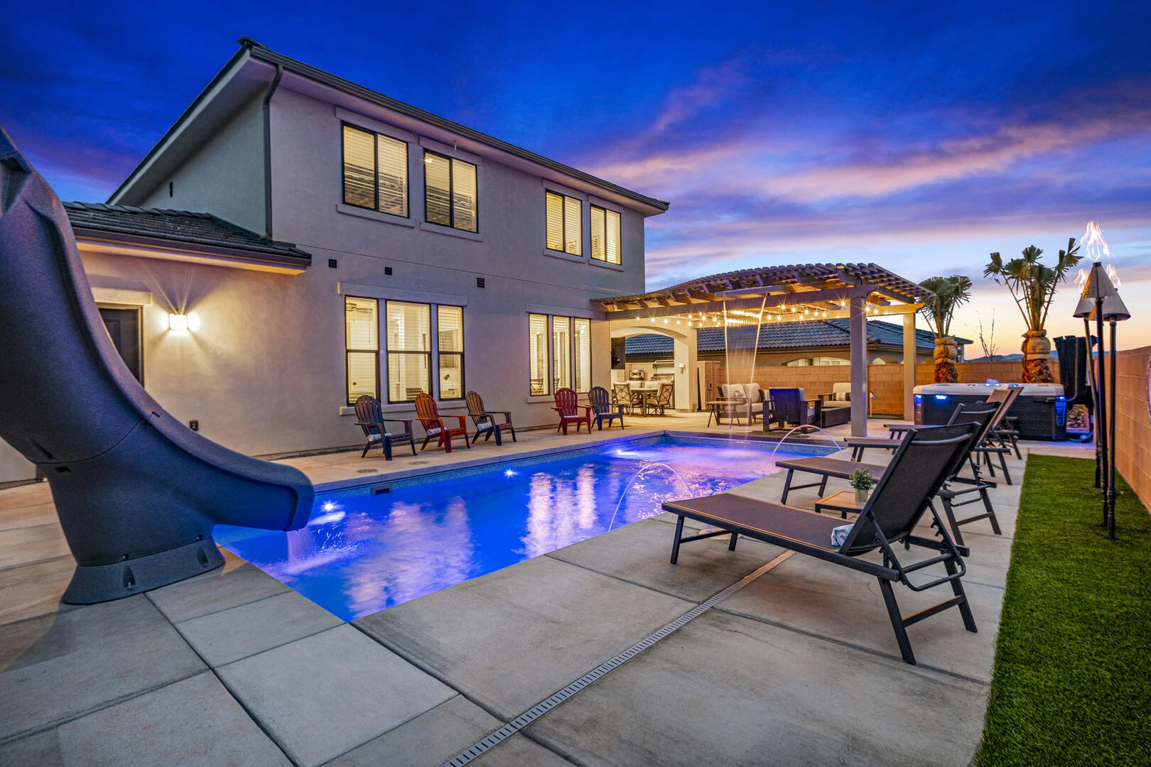 This spacious vacation retreat comfortably sleeps 10 guests with their own beds. Designed to cater perfectly to golf groups, this home offers an array of luxurious amenities. The five beautifully appointed bedrooms each come with an ensuite bathroom and TV. For added fun, unwind in the cozy loft, featuring a game area complete with a pinball machine, Nintendo Switch, and board games. The great room features an 85-inch TV. Outdoors, enjoy a private backyard oasis with a 6-ft deep pool with a slide and waterfall, hot tub, fire pit, water feature, putting green, and outdoor kitchen with a pizza oven — ideal for evenings of hanging out with the group to talk about the good, and bad shots of the day. The Retreat at Crimson Ridge is also part of the Paseos HOA, with access to pickleball courts and a large pool, with a lazy river and two-story slide. The home also includes a fully equipped game room with an Xbox, ping pong, foosball, arcade games, and a gym, making it a perfect choice for golf groups looking to create lasting memories.