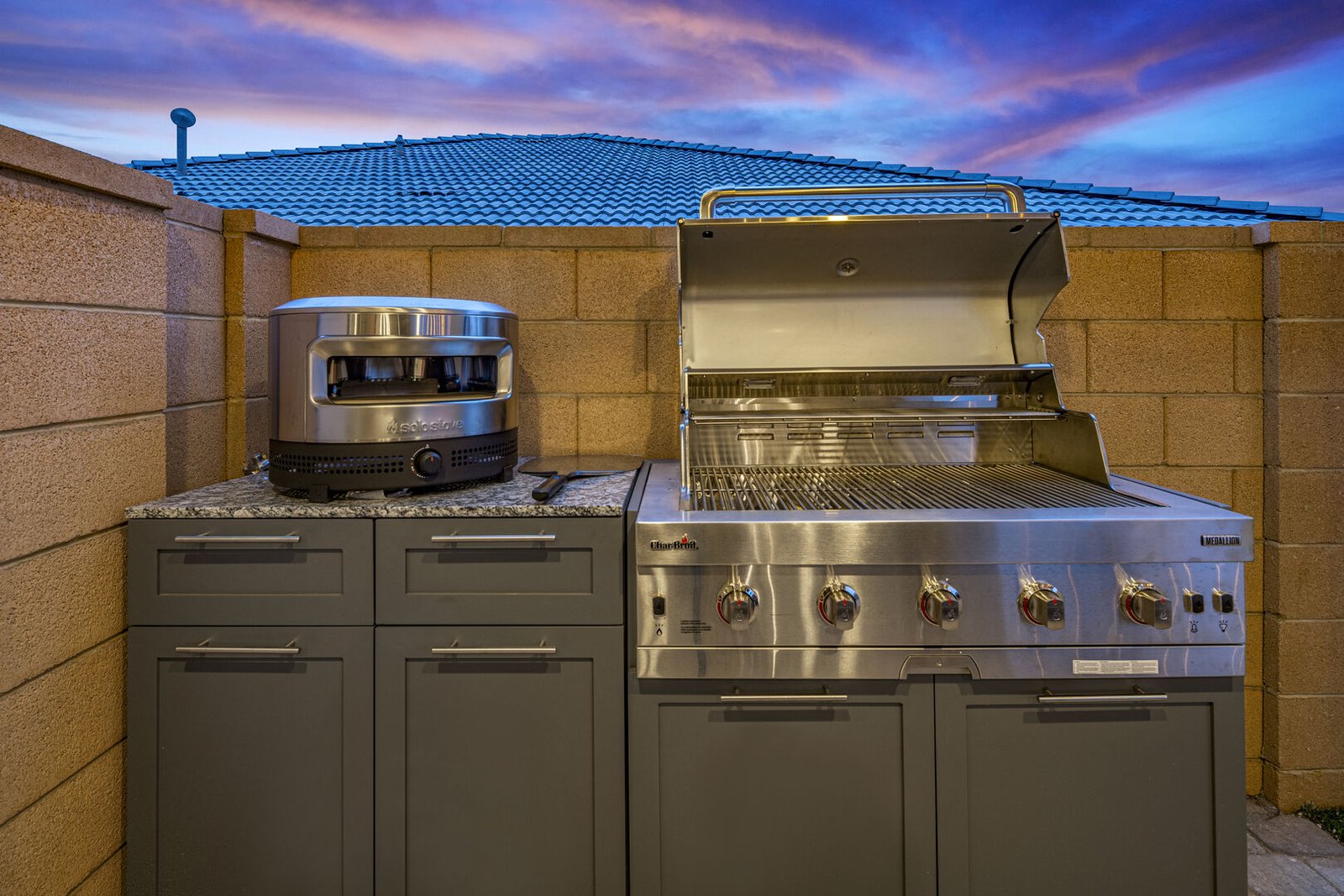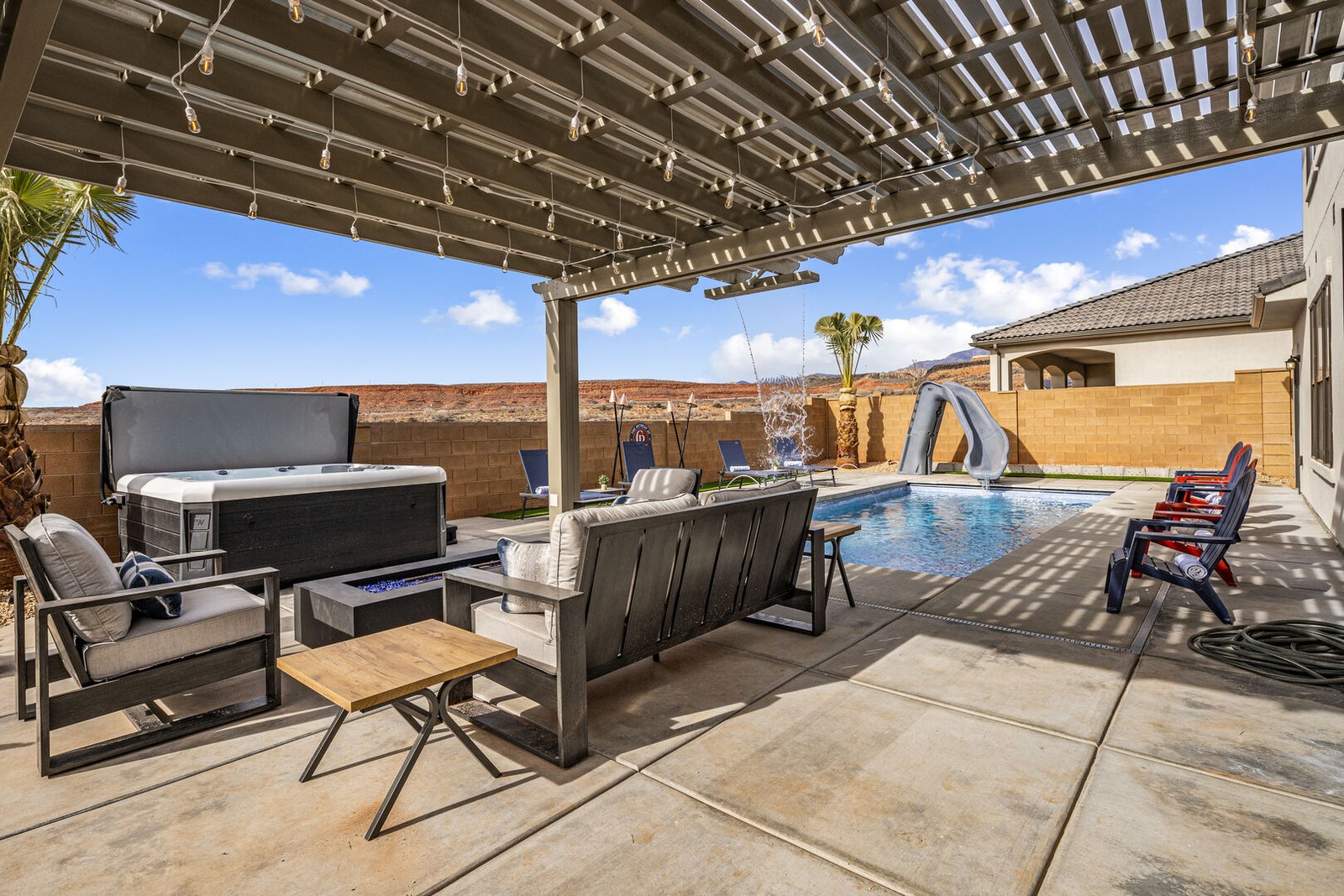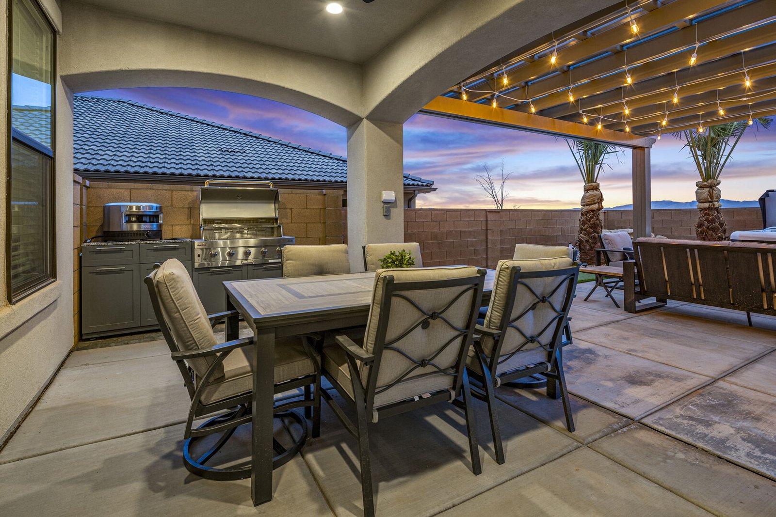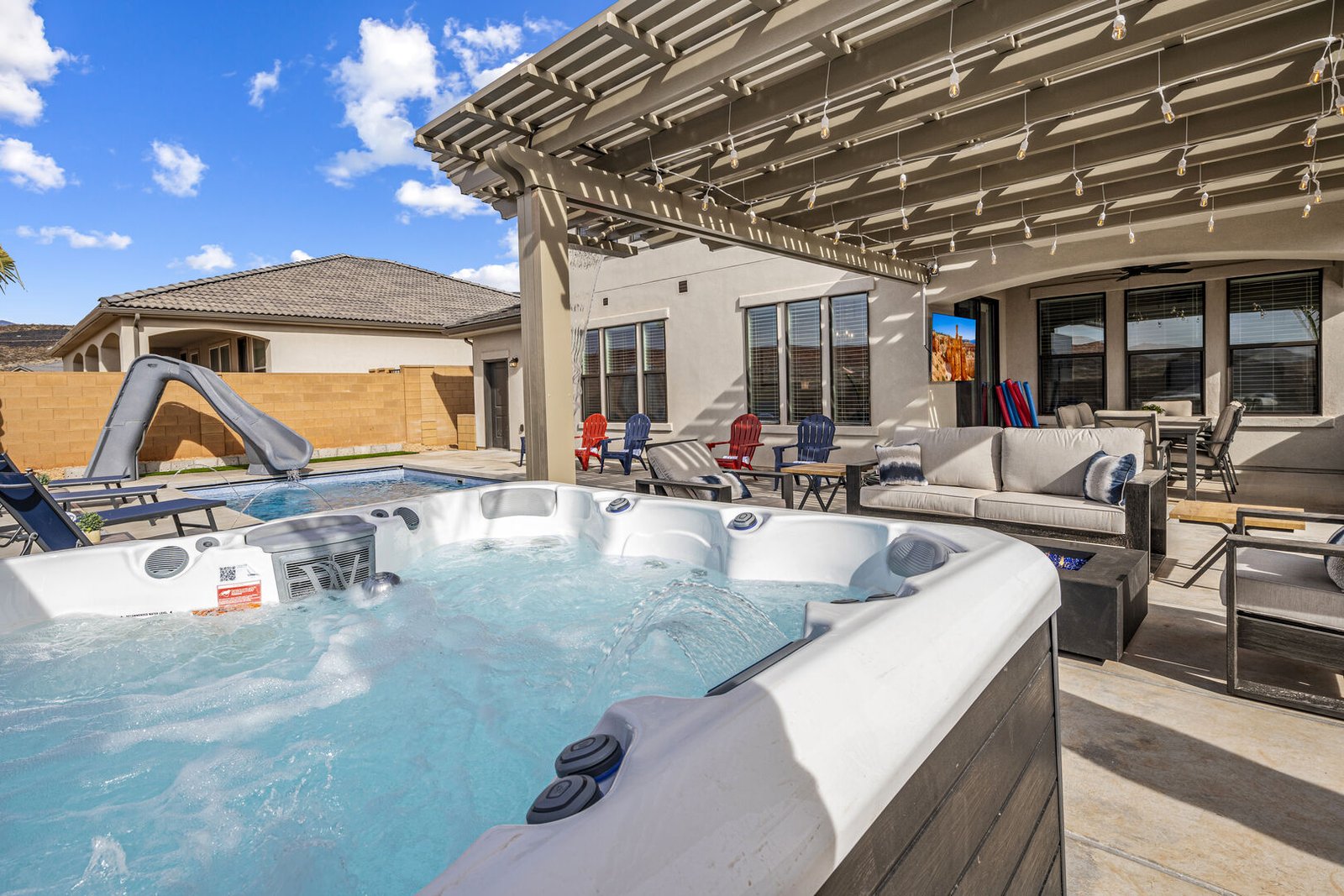 This spacious vacation retreat comfortably sleeps 10 guests with their own beds. Designed to cater perfectly to golf groups, this home offers an array of luxurious amenities. The five beautifully appointed bedrooms each come with an ensuite bathroom and TV. For added fun, unwind in the cozy loft, featuring a game area complete with a pinball machine, Nintendo Switch, and board games. The great room features an 85-inch TV. Outdoors, enjoy a private backyard oasis with a 6-ft deep pool with a slide and waterfall, hot tub, fire pit, water feature, putting green, and outdoor kitchen with a pizza oven — ideal for evenings of hanging out with the group to talk about the good, and bad shots of the day. The Retreat at Crimson Ridge is also part of the Paseos HOA, with access to pickleball courts and a large pool, with a lazy river and two-story slide. The home also includes a fully equipped game room with an Xbox, ping pong, foosball, arcade games, and a gym, making it a perfect choice for golf groups looking to create lasting memories.