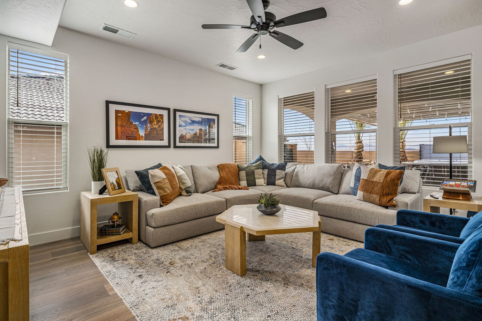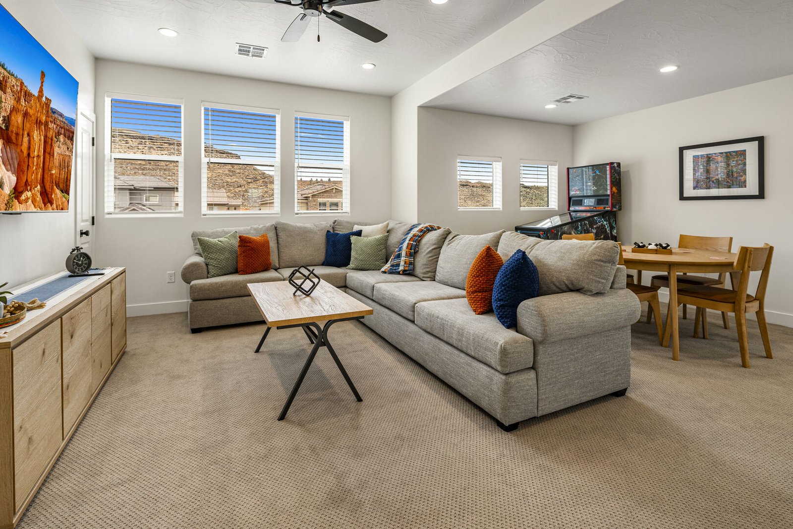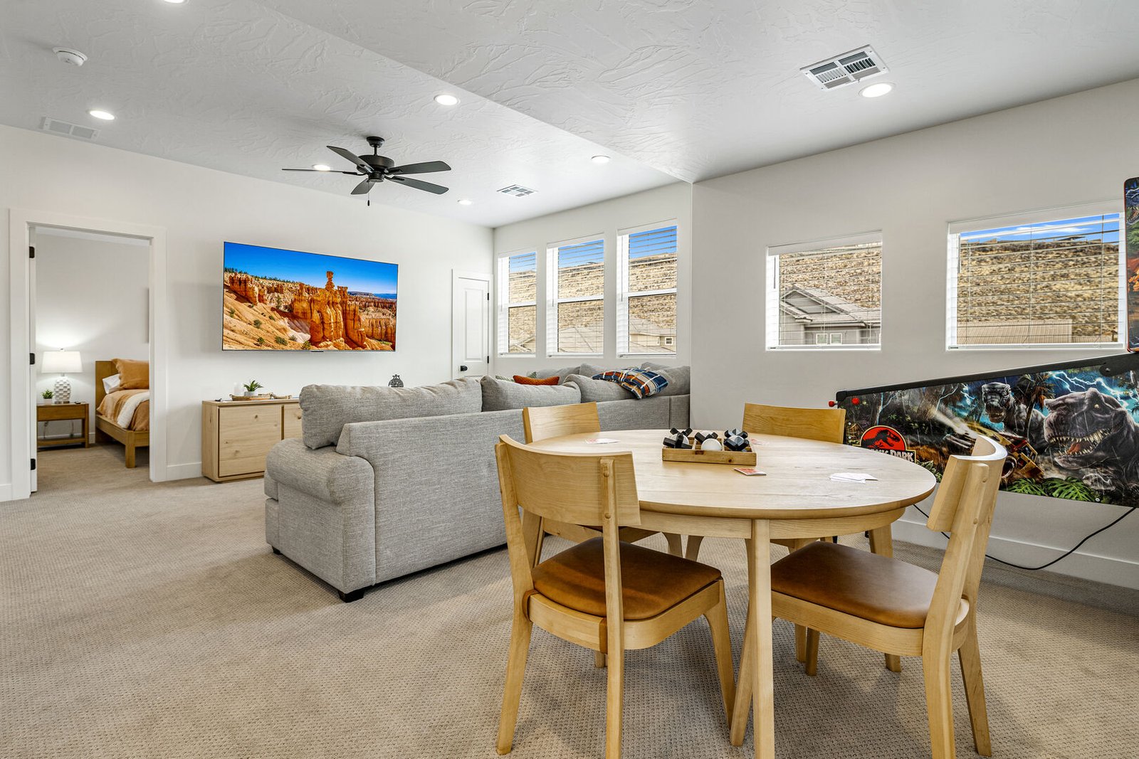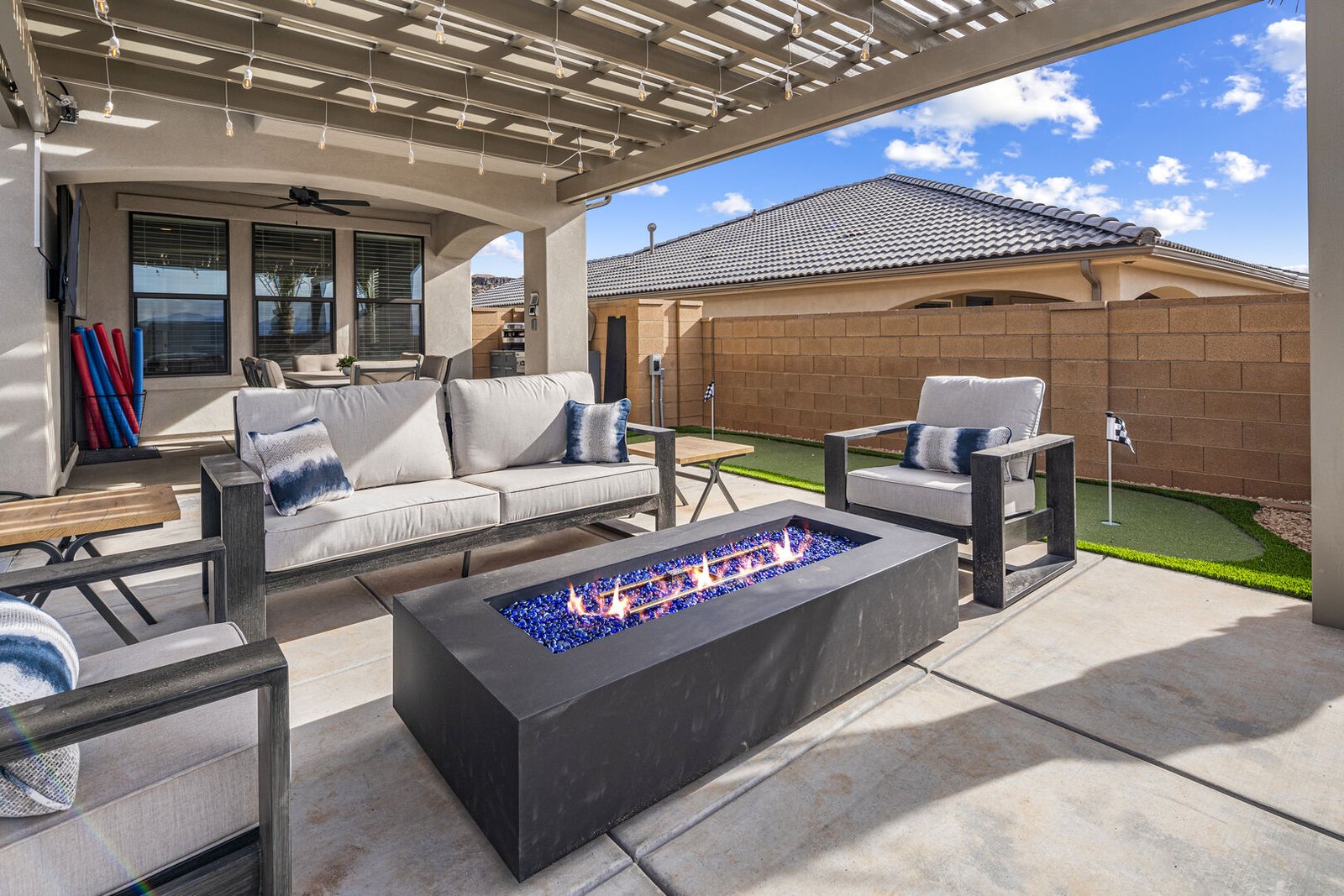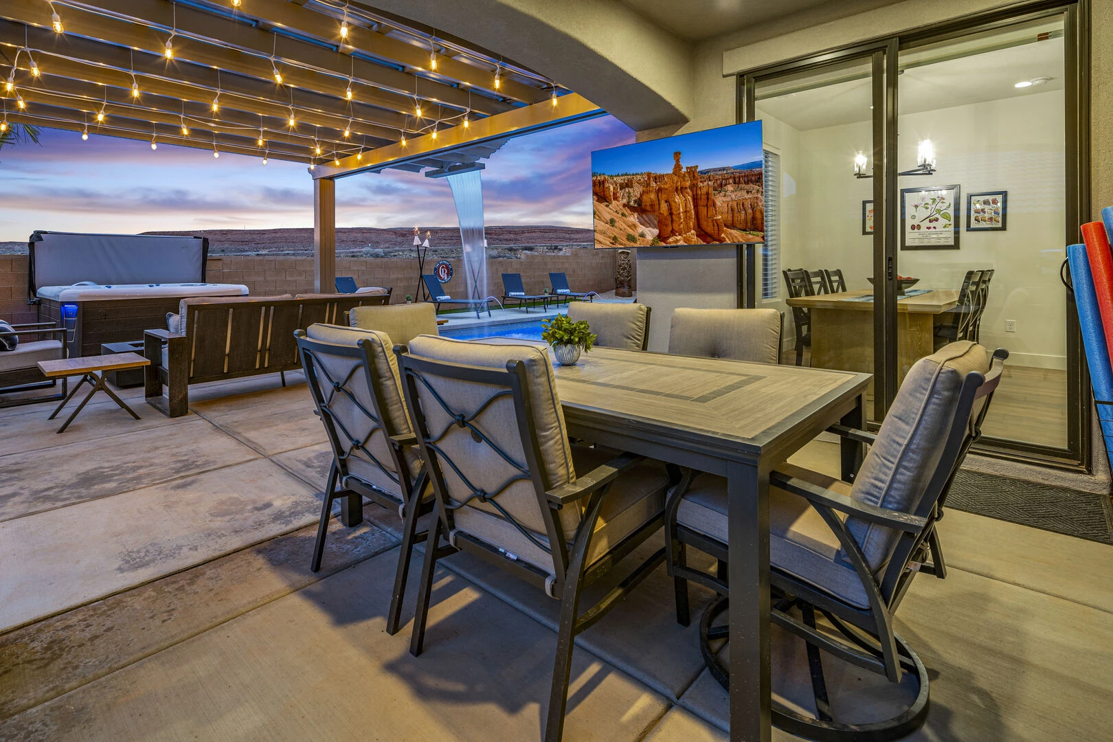 This spacious vacation retreat comfortably sleeps 10 guests with their own beds. Designed to cater perfectly to golf groups, this home offers an array of luxurious amenities. The five beautifully appointed bedrooms each come with an ensuite bathroom and TV. For added fun, unwind in the cozy loft, featuring a game area complete with a pinball machine, Nintendo Switch, and board games. The great room features an 85-inch TV. Outdoors, enjoy a private backyard oasis with a 6-ft deep pool with a slide and waterfall, hot tub, fire pit, water feature, putting green, and outdoor kitchen with a pizza oven — ideal for evenings of hanging out with the group to talk about the good, and bad shots of the day. The Retreat at Crimson Ridge is also part of the Paseos HOA, with access to pickleball courts and a large pool, with a lazy river and two-story slide. The home also includes a fully equipped game room with an Xbox, ping pong, foosball, arcade games, and a gym, making it a perfect choice for golf groups looking to create lasting memories.