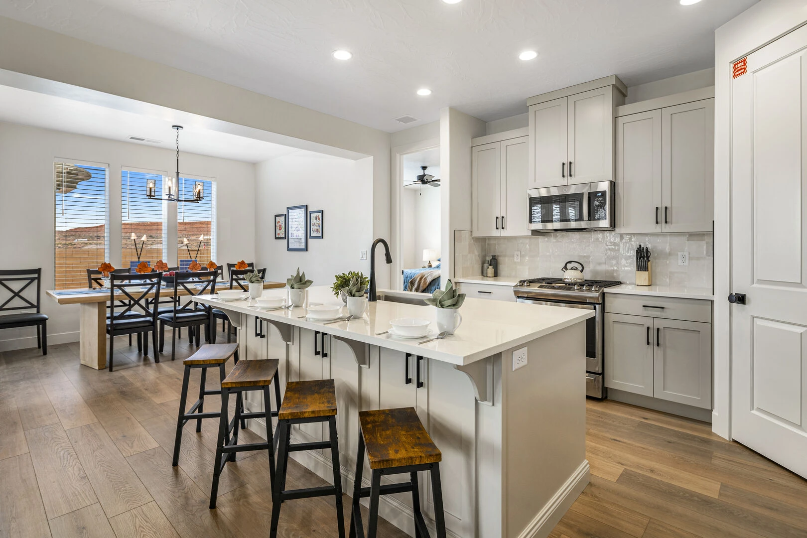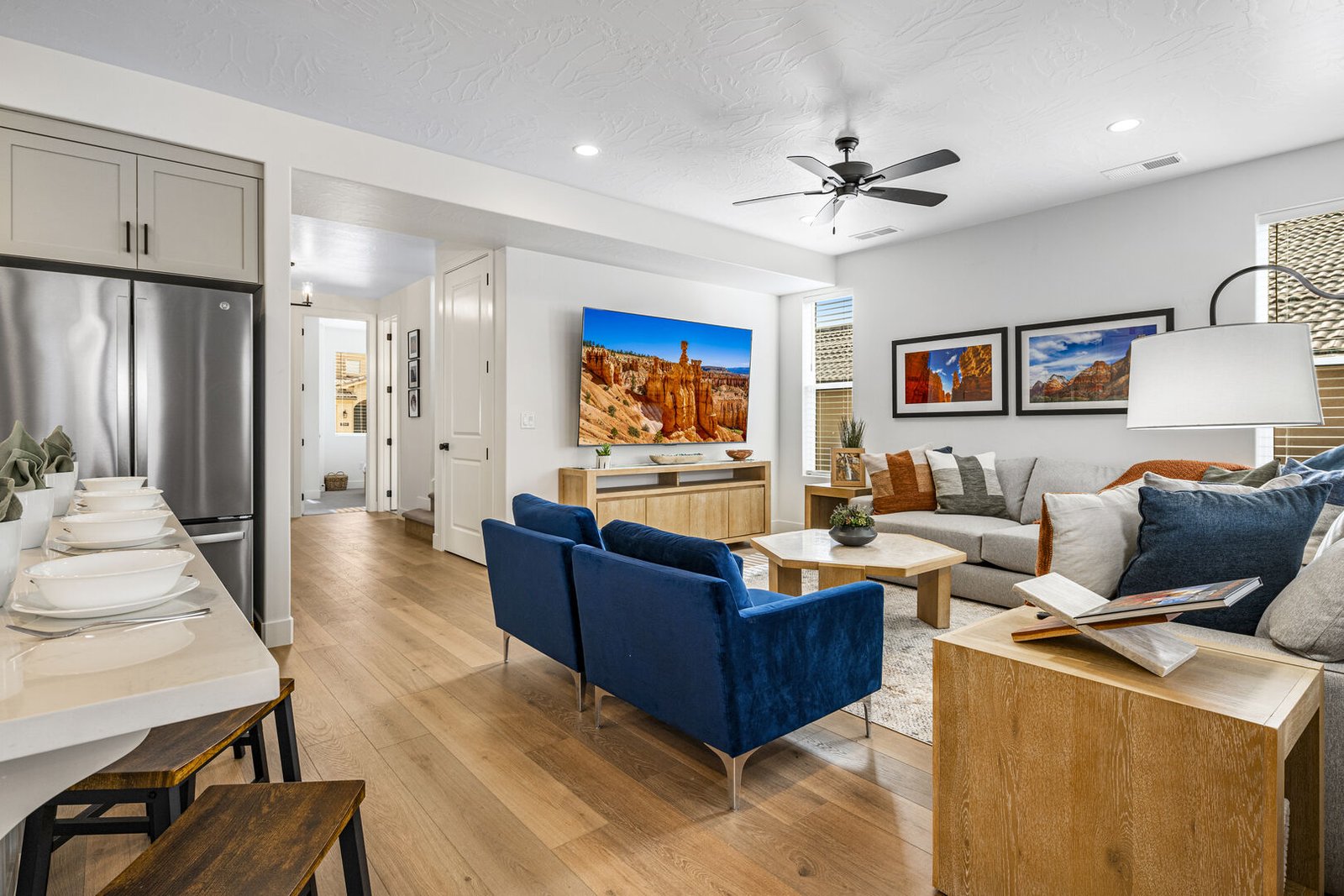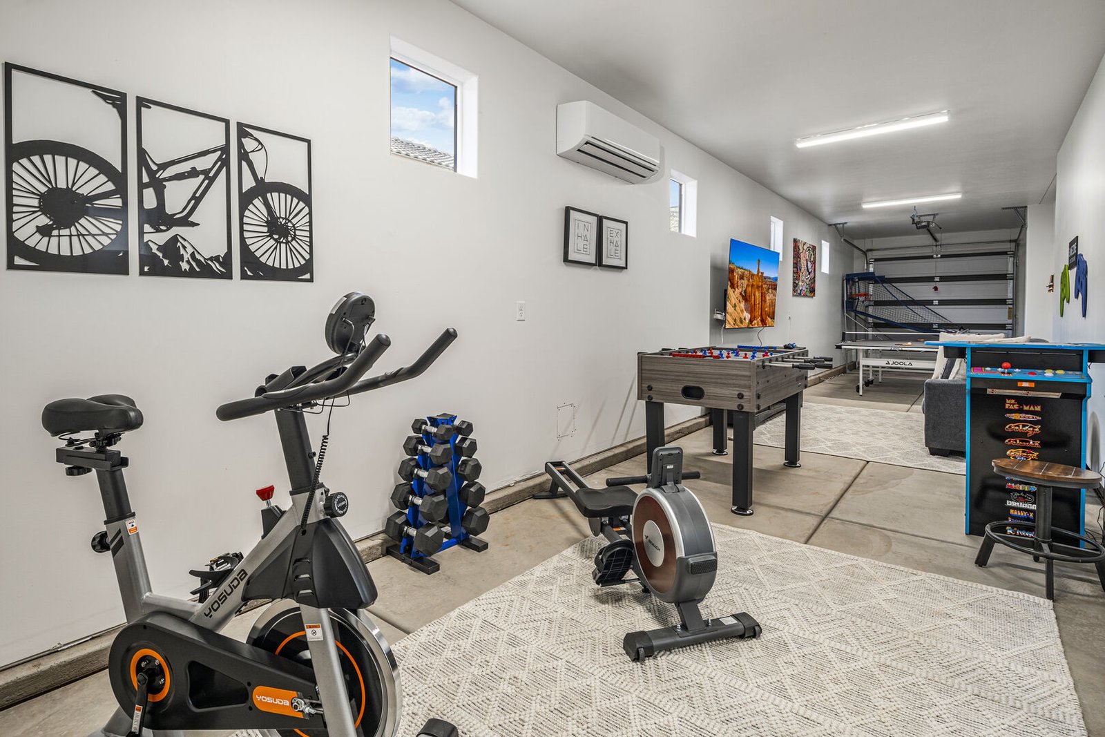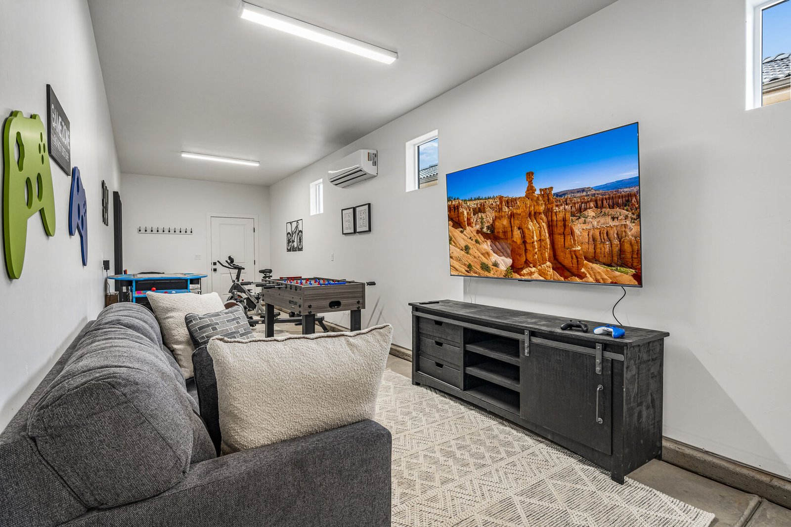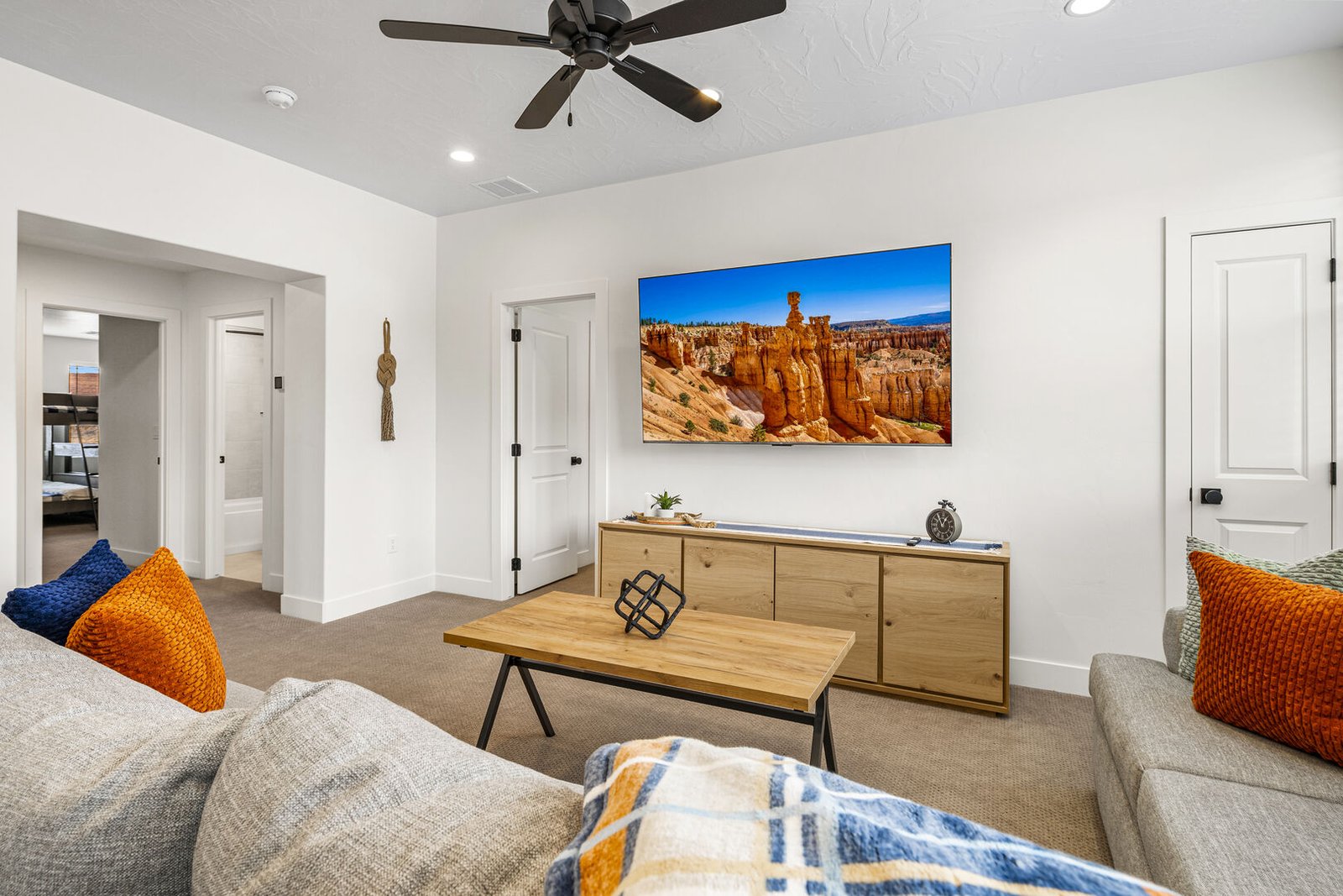 This spacious vacation retreat comfortably sleeps 10 guests with their own beds. Designed to cater perfectly to golf groups, this home offers an array of luxurious amenities. The five beautifully appointed bedrooms each come with an ensuite bathroom and TV. For added fun, unwind in the cozy loft, featuring a game area complete with a pinball machine, Nintendo Switch, and board games. The great room features an 85-inch TV. Outdoors, enjoy a private backyard oasis with a 6-ft deep pool with a slide and waterfall, hot tub, fire pit, water feature, putting green, and outdoor kitchen with a pizza oven — ideal for evenings of hanging out with the group to talk about the good, and bad shots of the day. The Retreat at Crimson Ridge is also part of the Paseos HOA, with access to pickleball courts and a large pool, with a lazy river and two-story slide. The home also includes a fully equipped game room with an Xbox, ping pong, foosball, arcade games, and a gym, making it a perfect choice for golf groups looking to create lasting memories.