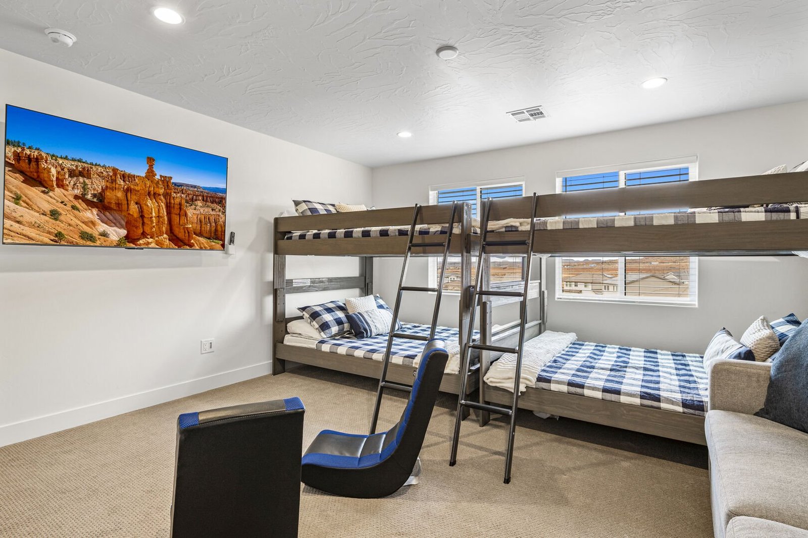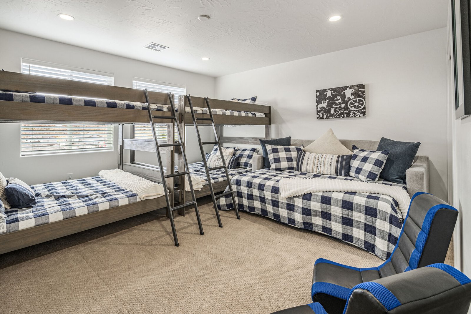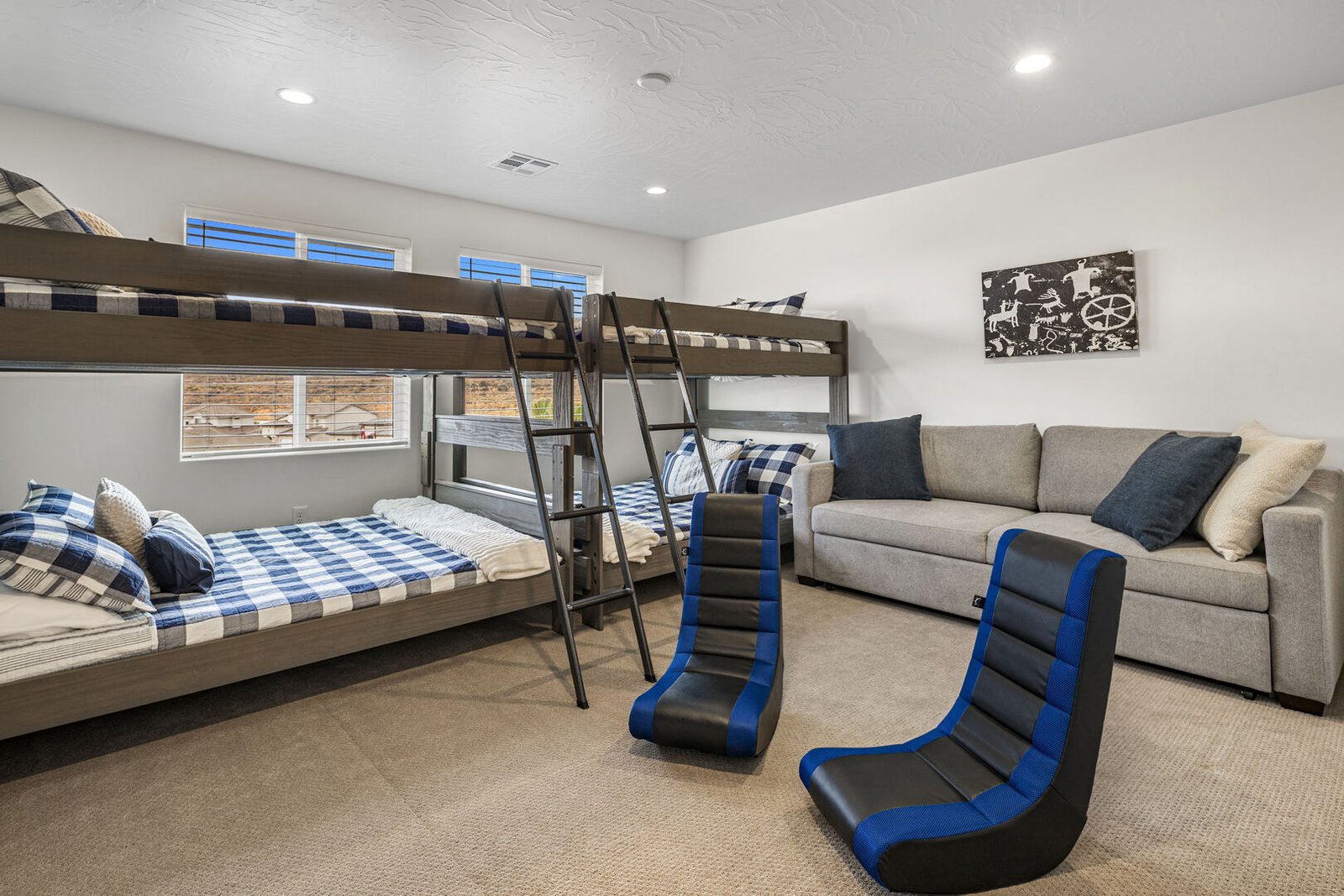 2 Queen-Sized Bunk Beds & Queen Pullout Sofa attached to a shared bathroom with a Shower/Tub Combo
